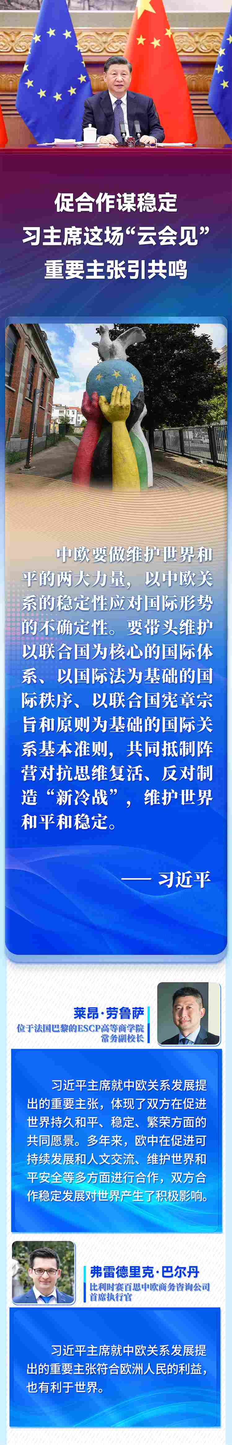 國(guó)家主席習(xí)近平4月1日晚在北京以視頻方式會(huì)見歐洲理事會(huì)主席米歇爾和歐盟委員會(huì)主席馮德萊恩。歐洲多國(guó)人士高度評(píng)價(jià)習(xí)近平主席就中歐關(guān)系、烏克蘭危機(jī)等問題提出的重要主張,認(rèn)為會(huì)晤為雙方關(guān)系持續(xù)健康發(fā)展作出戰(zhàn)略引領(lǐng),為復(fù)雜動(dòng)蕩的國(guó)際局勢(shì)注入穩(wěn)定性。