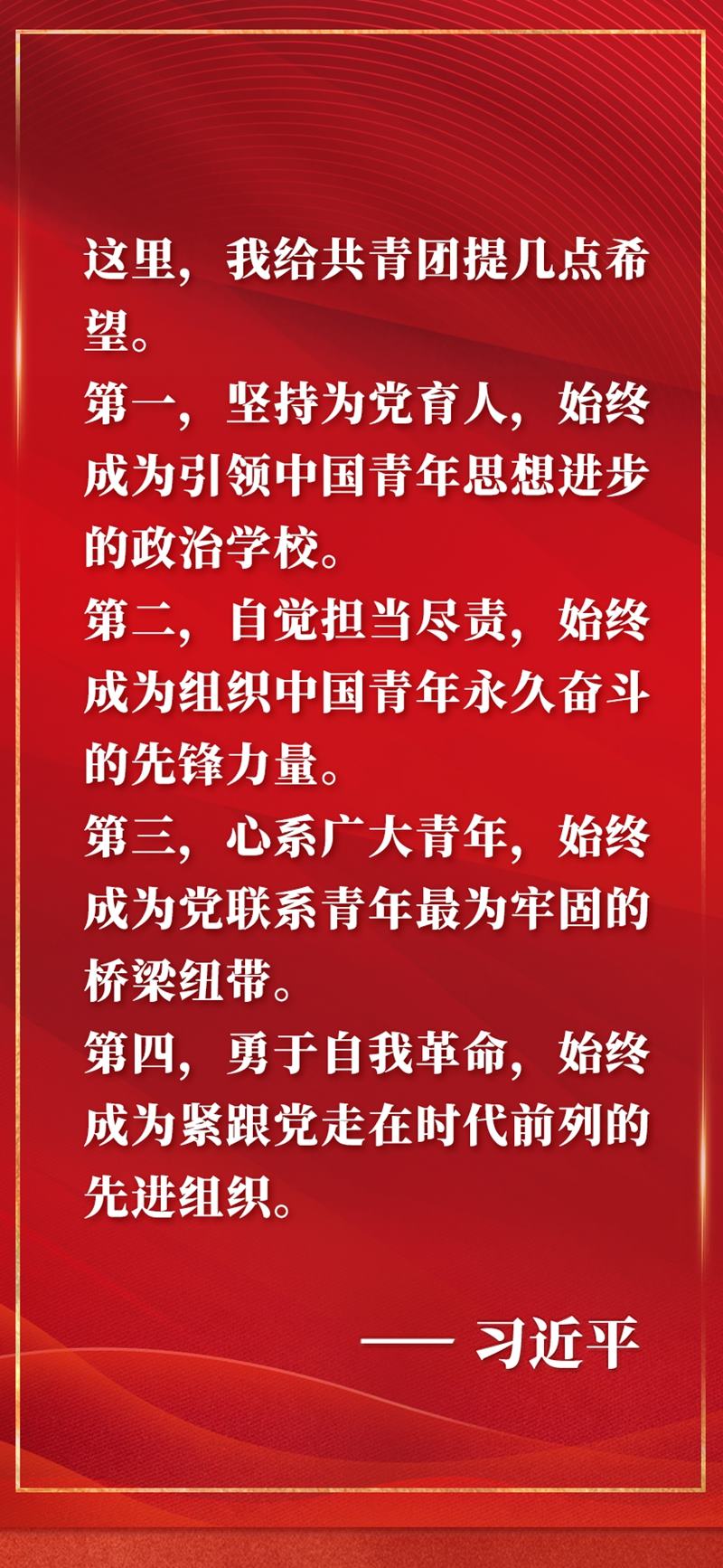 慶祝中國共產(chǎn)主義青年團成立100周年大會10日上午在北京人民大會堂隆重舉行。中共中央總書記、國家主席、中央軍委主席習近平在會上發(fā)表重要講話,全面回顧百年來共青團堅定不移聽黨話、跟黨走的奮斗歷程,深刻闡明共青團和青年工作的寶貴經(jīng)驗,對當代青年寄予殷切期望,對做好新時代共青團工作提出明確要求。