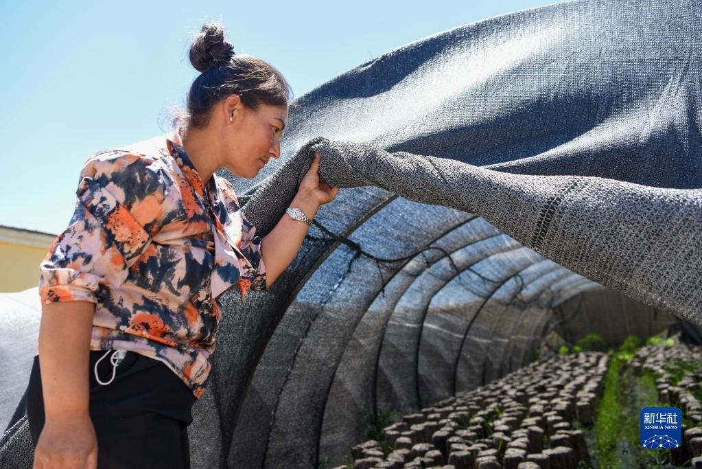 在新疆烏什縣依麻木鎮(zhèn),在新疆維吾爾自治區(qū)黨委組織部、老干部局駐托萬克麥蓋提村“訪民情惠民生聚民心”工作隊的幫助下,不少村民通過培植木耳增收致富(2022年6月7日攝)。新華社記者 丁磊 攝