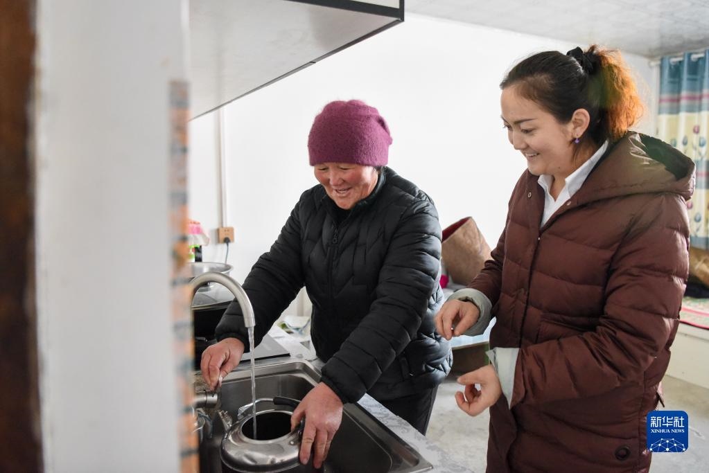 在新疆福??h解特阿熱勒鎮(zhèn)京什開薩爾村,村干部(右)來到前不久剛接通自來水的村民家中了解水質情況(2021年11月25日攝)。新華社記者 丁磊 攝