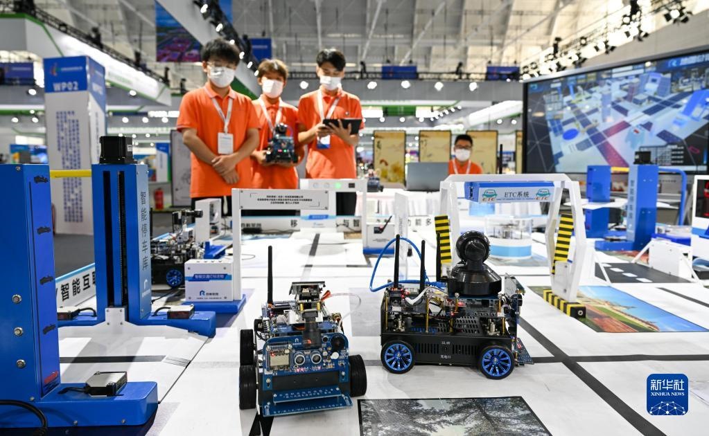 在天津舉行的世界職業(yè)技術(shù)教育發(fā)展大會(huì)首屆世界職業(yè)院校技能大賽上,參賽選手在實(shí)訓(xùn)沙盤(pán)前操作機(jī)器人設(shè)備(2022年8月20日攝)。新華社記者 孫凡越 攝