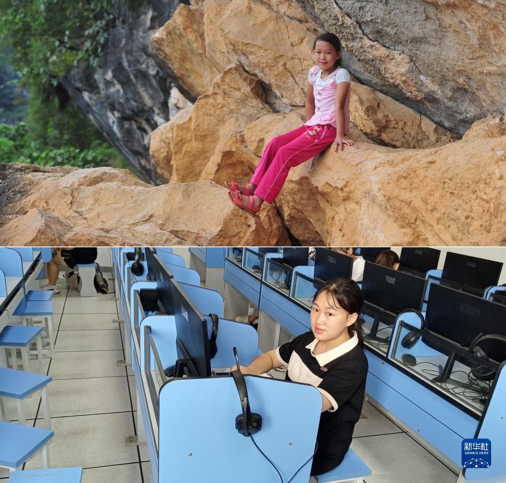 這是一張拼版照片,上圖為:在廣西大化瑤族自治縣板升鄉(xiāng)弄雷村哈保屯,11歲的蒙秋艷在懸崖邊休息,這一處約300米長(zhǎng)的半山懸崖,是她讀小學(xué)期間每天都要走的路(2012年9月5日新華社記者黃孝邦攝);下圖為:已經(jīng)實(shí)現(xiàn)大學(xué)夢(mèng)想的蒙秋艷,就讀于廣西醫(yī)科大學(xué),這是她在學(xué)校的語(yǔ)音室學(xué)習(xí)(新華社發(fā),2022年9月5日韋婷婷攝)。新華社發(fā)
