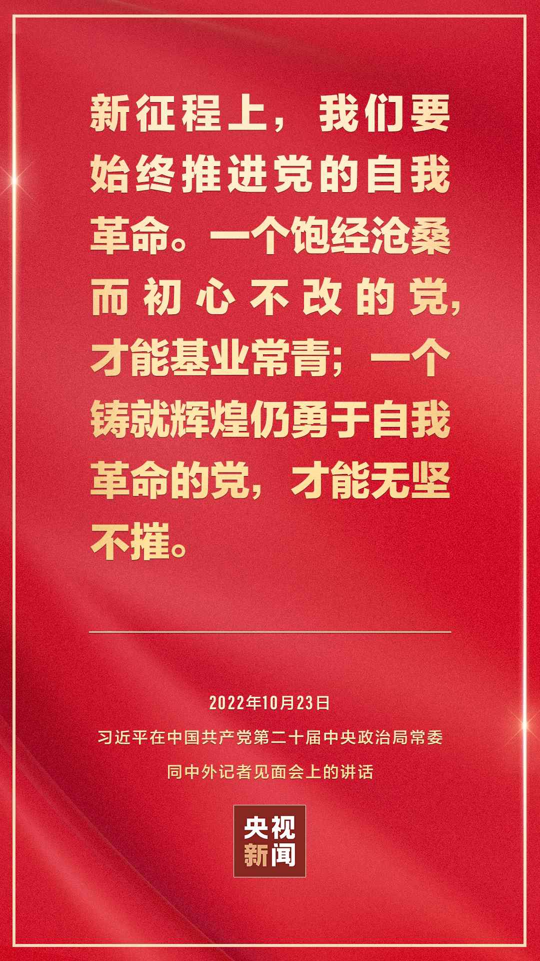 在中國共產(chǎn)黨第二十屆中央委員會第一次全體會議上當選的中共中央總書記習近平和中共中央政治局常委李強、趙樂際、王滬寧、蔡奇、丁薛祥、李希,23日中午在人民大會堂同采訪中共二十大的中外記者見面。習近平發(fā)表重要講話。