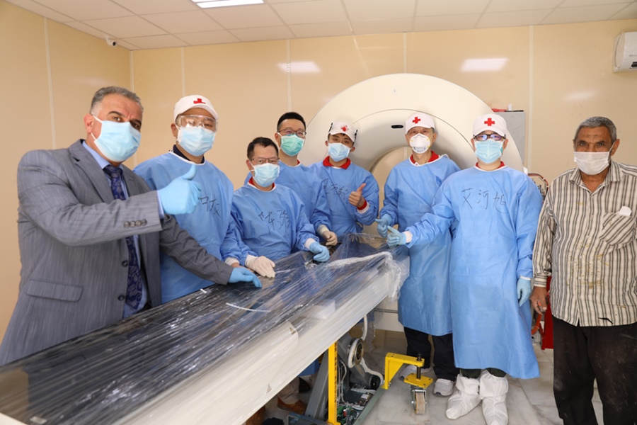 2020年4月12日,在伊拉克首都巴格達,援助伊拉克防治新冠肺炎的中國醫(yī)療專家將CT設備搬運到機房后與伊方人員合影。