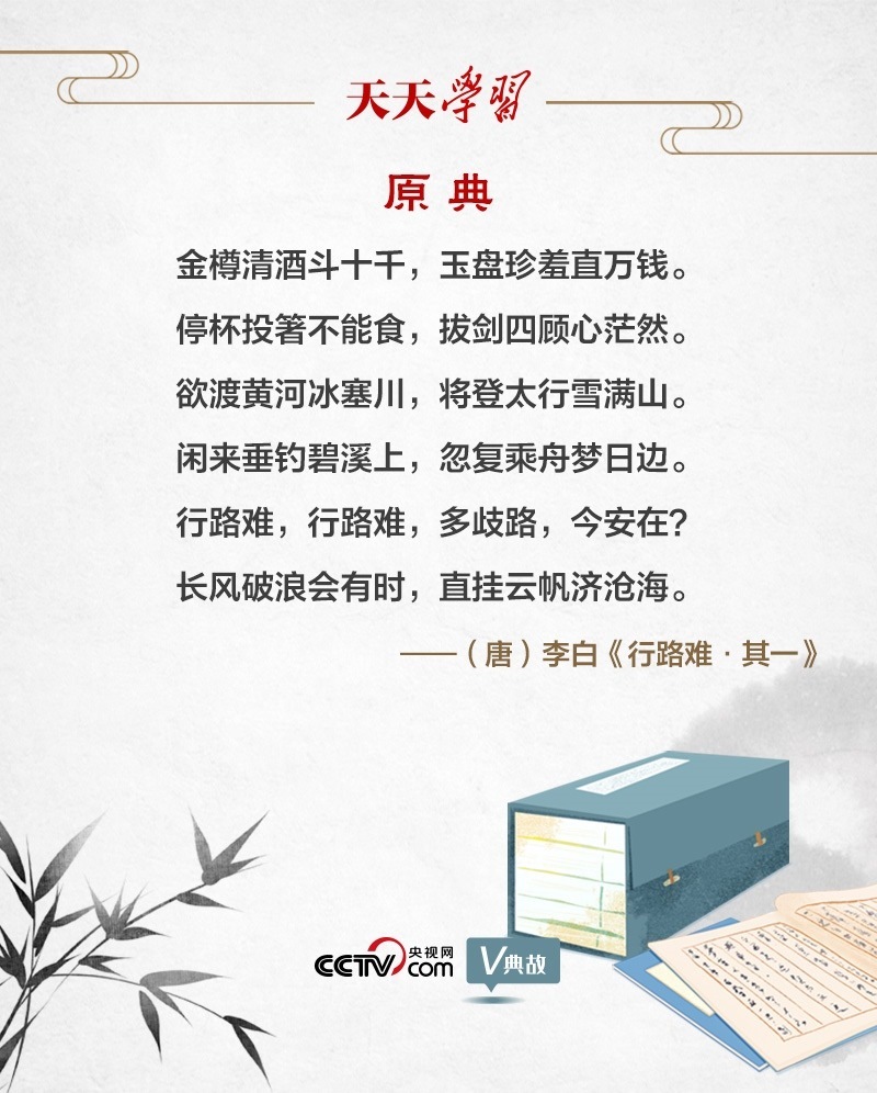 “行路難”為樂府古題,多詠嘆世路艱難及貧困孤苦的處境。李白的《行路難》共三首,“長風破浪會有時”出自第一首。唐天寶元年(742年),李白奉詔入京,擔任翰林供奉。后因權臣讒毀排擠,被“賜金放還”。《行路難》便是李白離開長安時所作。