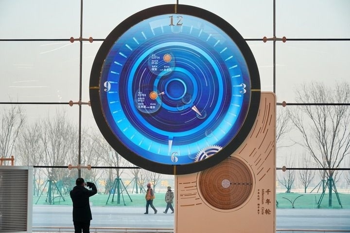 雄安站候車廳,一座“千年輪”吸引著往來(lái)旅客的目光。它的起始日期被設(shè)定為2017年4月1日——“雄安”第一次被公眾知曉的日子?!扒贻啞钡牡鬃希澘讨?個(gè)金色大字——“千年之計(jì) 始于當(dāng)下”。齒輪不停地轉(zhuǎn)動(dòng),記錄下歷史前進(jìn)的軌跡。