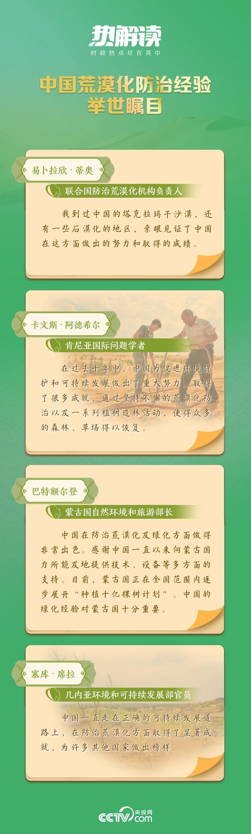 在6月6日召開的座談會(huì)上,總書記講到從“沙進(jìn)人退”到“綠進(jìn)沙退”的歷史性轉(zhuǎn)變,講到荒漠化區(qū)域經(jīng)濟(jì)社會(huì)發(fā)展和生態(tài)面貌發(fā)生了翻天覆地的變化,講到荒漠化和土地沙化實(shí)現(xiàn)“雙縮減”,講到防沙治沙法律法規(guī)體系日益健全……這些成績(jī),讓14億多中國(guó)人民都倍感榮光。
