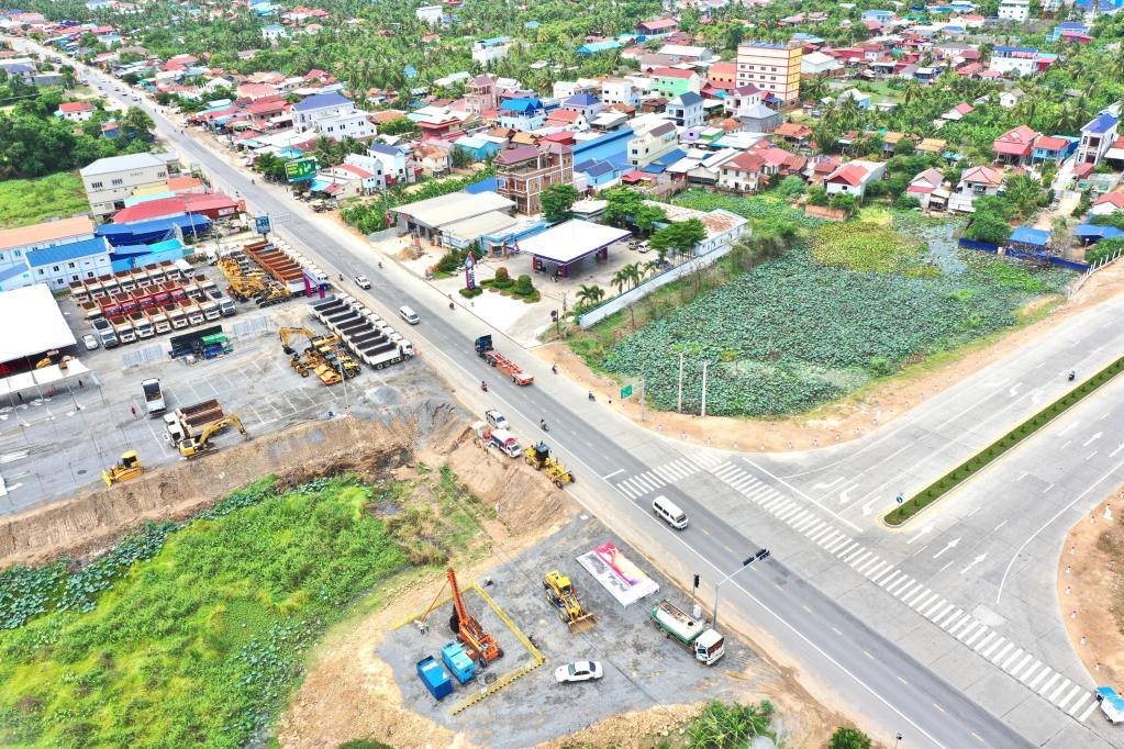 這是6月5日在柬埔寨干丹省拍攝的金巴高速公路施工起點(無人機照片)。
