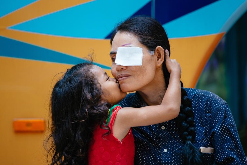 2019年3月15日,在柬埔寨磅湛省醫(yī)院,即將接受白內(nèi)障手術(shù)的患者孫美樂接受女兒的親吻祝福。在接受了中國醫(yī)療隊的白內(nèi)障義診手術(shù)后,她的視力逐步恢復,生活有了新的光明和希望。