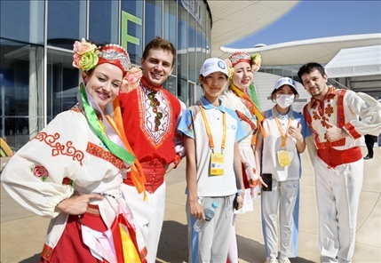 △6月15日,來(lái)自白俄羅斯的演員在表演結(jié)束后與志愿者合影。當(dāng)日,上海合作組織產(chǎn)業(yè)鏈供應(yīng)鏈論壇暨2023上合國(guó)際投資貿(mào)易博覽會(huì)在青島開幕。