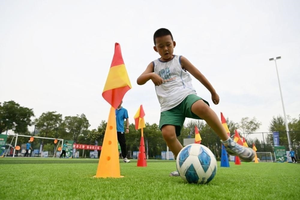 △2023年8月6日,一位小朋友在寧夏全民健身日主題示范系列活動(dòng)現(xiàn)場體驗(yàn)趣味足球。