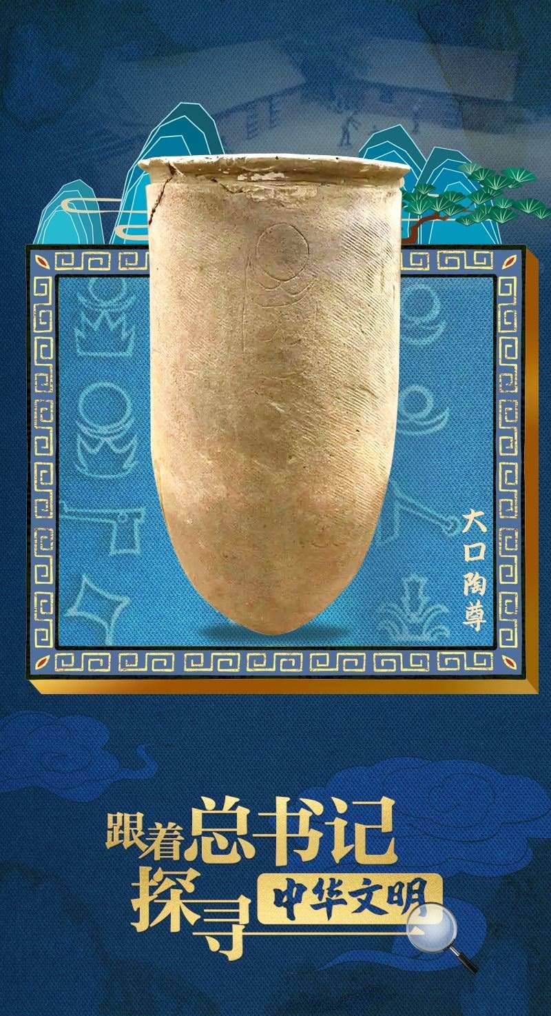 2023年6月2日,習近平總書記來到中國歷史研究院考察調(diào)研。展廳內(nèi),總書記沿“歷史大道”前行,仔細詢問最新考古發(fā)掘成果和文物展品保護情況。講解員指著一件陶器展品向總書記介紹:“這是一件出土于安徽蒙城新石器時代尉遲寺遺址的大口陶尊,距今大約4800年?!笨倳浽儐枺骸爸袊鞘澜缟咸掌髌鹪醋钤绲膰覇??”