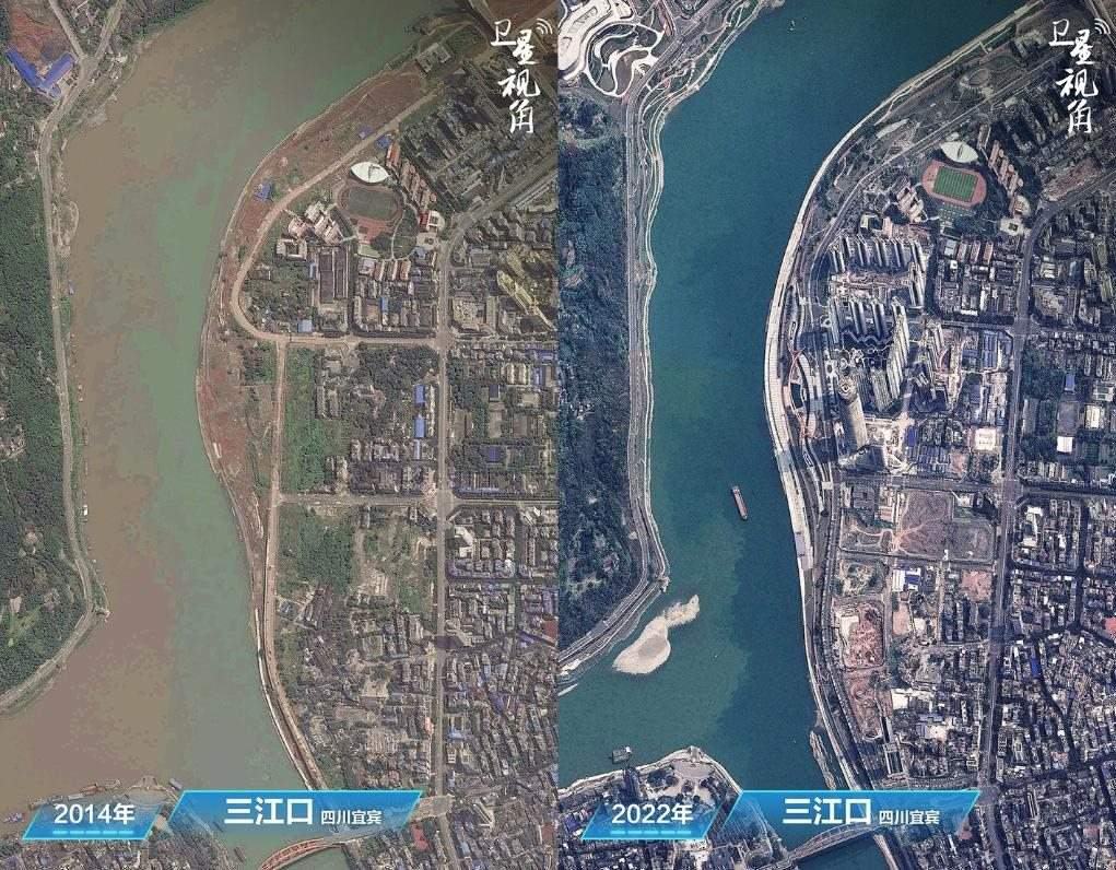↑2022年與2014年相比,四川宜賓三江口更綠了,岸線更美了。
