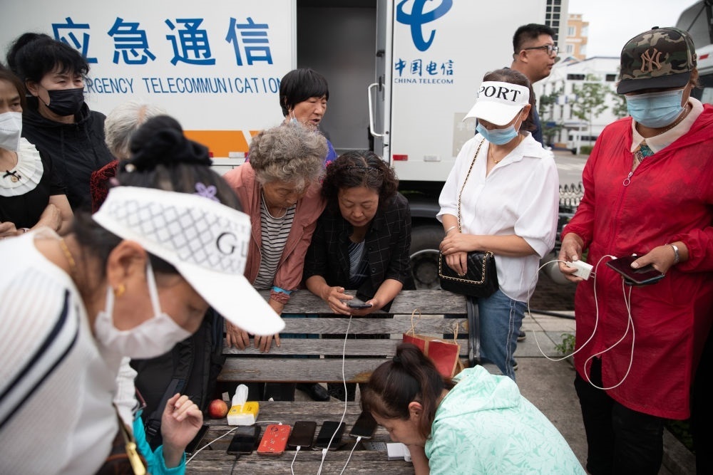 8月6日,群眾在黑龍江省海林市長汀鎮(zhèn)一廣場上的應急通信車前與外界通話。