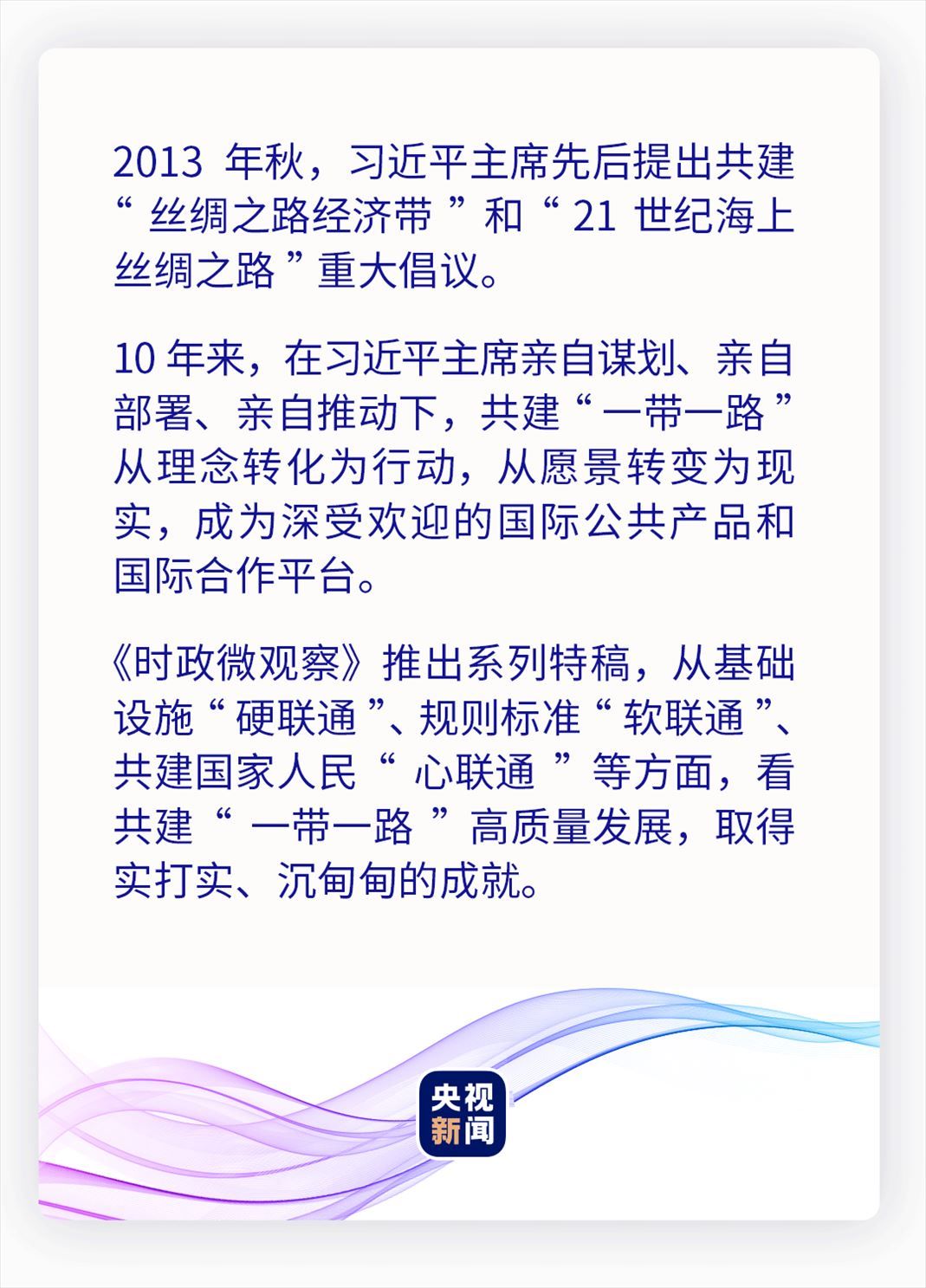 10年來,中國與共建國家以基礎(chǔ)設(shè)施“硬聯(lián)通”為重要方向,攜手前行。在“鋼鐵駝隊(duì)”的汽笛聲里、在跨海大橋上的車流中、在“空中絲綢之路”的萬米高空、在“數(shù)字絲綢之路”的“云端”……一條條幸福路、繁榮路,鋪就一幅共建“一帶一路”的壯闊畫卷。