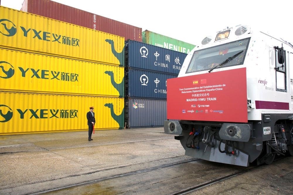 △2023年3月9日,以“中西建交紀(jì)念號”特別命名的“義新歐”中歐班列從馬德里鳴笛發(fā)車,與從義烏同時(shí)開出的列車雙向而行。