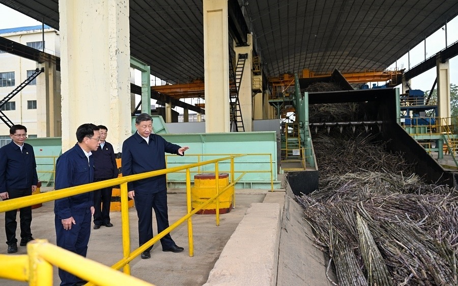 14日下午,習(xí)近平總書記在廣西來賓市考察調(diào)研。他先后來到來賓市國(guó)家現(xiàn)代農(nóng)業(yè)產(chǎn)業(yè)園黃安優(yōu)質(zhì)“雙高”糖料蔗基地和東糖鳳凰有限公司,了解甘蔗良種繁育、種植收成、糖產(chǎn)業(yè)發(fā)展等情況。(人民日?qǐng)?bào)記者 徐雋)