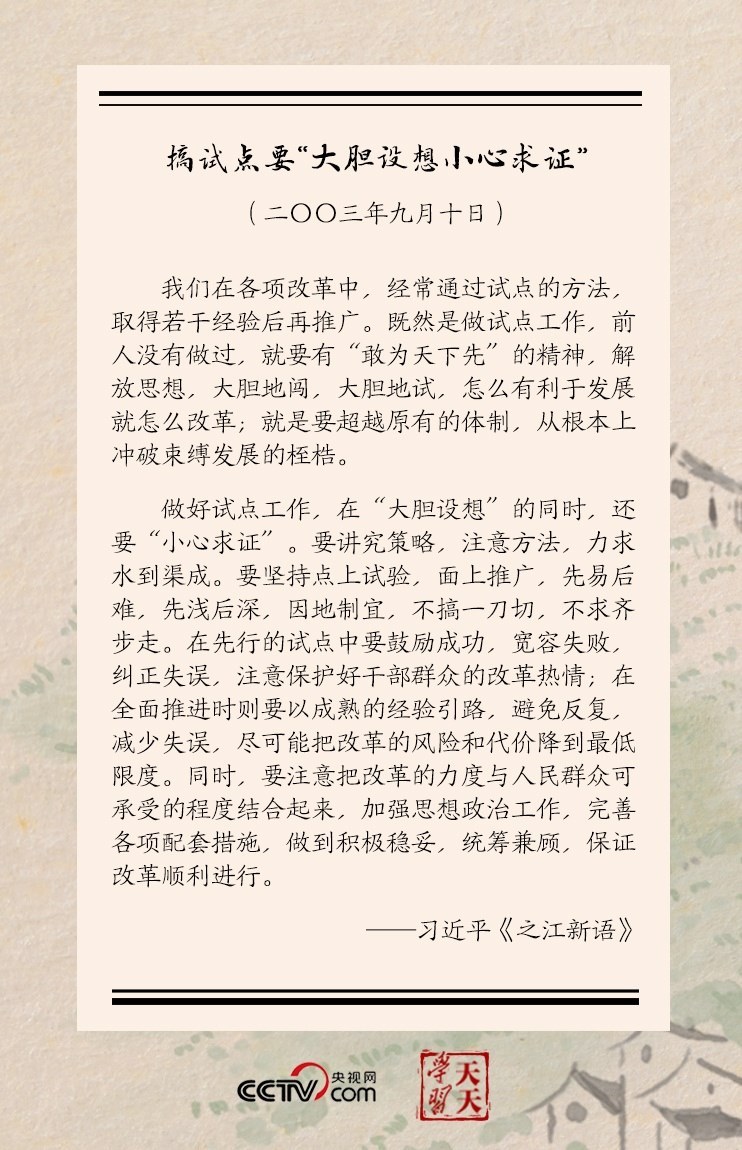 習(xí)近平還進一步分析,做好試點工作,在“大膽設(shè)想”的同時,還要“小心求證”……要堅持點上試驗,面上推廣,先易后難,先淺后深,因地制宜,不搞一刀切,不求齊步走……