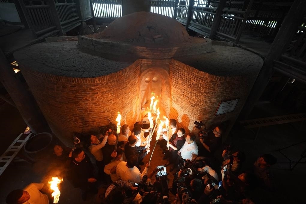 2023年10月19日,嘉賓與把樁師傅一起對葫蘆窯進行復(fù)燒點火。當日,作為2023中國景德鎮(zhèn)國際陶瓷博覽會的活動之一,景德鎮(zhèn)古窯民俗博覽區(qū)對重建的明代葫蘆窯進行點火復(fù)燒。同時,景德鎮(zhèn)歷代瓷窯活態(tài)傳承紀實館開館。新華社記者 周密 攝