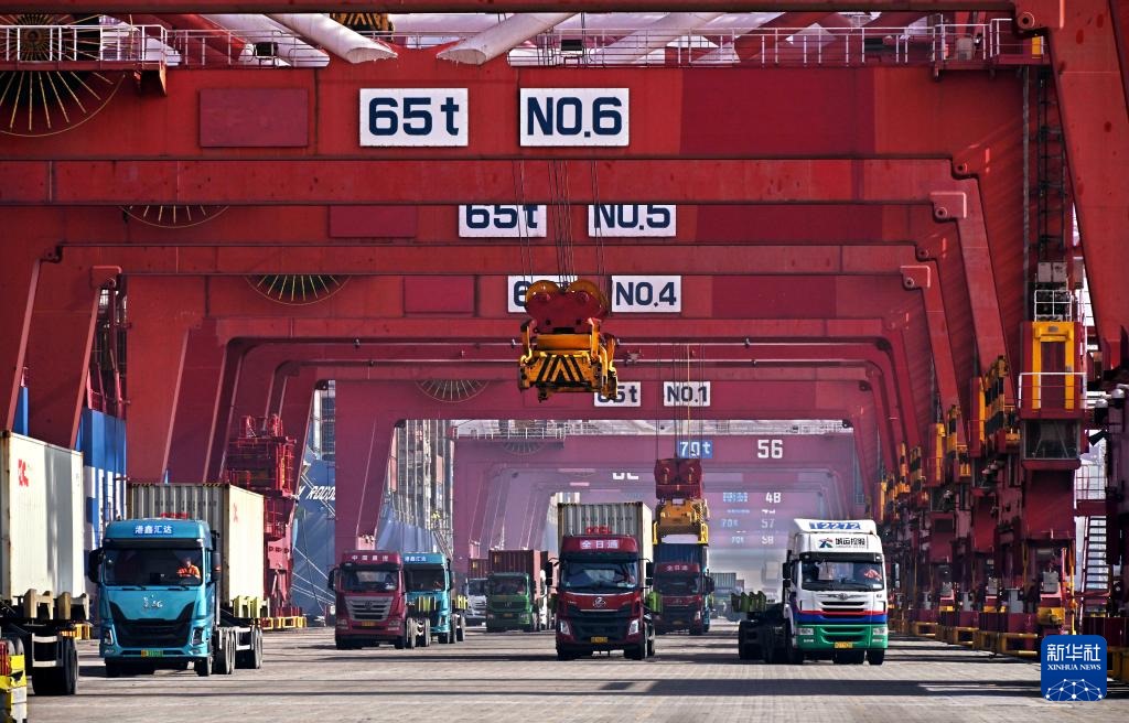??2024年2月11日,卡車在青島港集裝箱碼頭裝運(yùn)集裝箱。新華社記者 李紫恒 攝