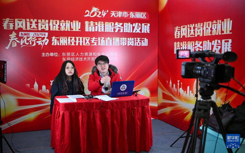 ??2024年2月29日,主播在天津市東麗區(qū)一場招聘會(huì)上進(jìn)行直播帶崗。新華社記者 孫凡越 攝