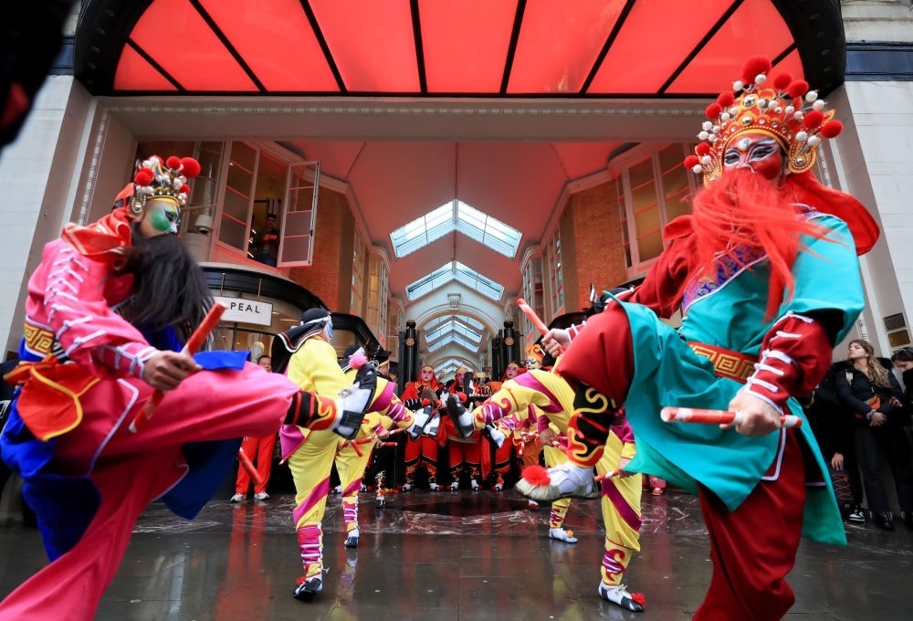 2024年2月10日,來自廣東普寧的英歌舞團演員在英國倫敦伯靈頓拱廊街表演英歌舞。新華社記者 李穎 攝