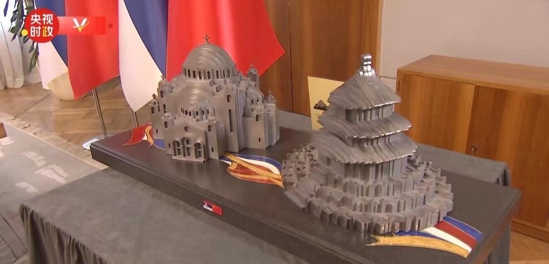 這份禮物是北京天壇和貝爾格萊德圣薩瓦教堂造型的鋼制工藝品,由中國(guó)河鋼集團(tuán)斯梅戴雷沃鋼廠(chǎng)生產(chǎn)的鋼材制成。望著這份禮物,習(xí)主席風(fēng)趣地說(shuō),是“鋼桿”朋友了。