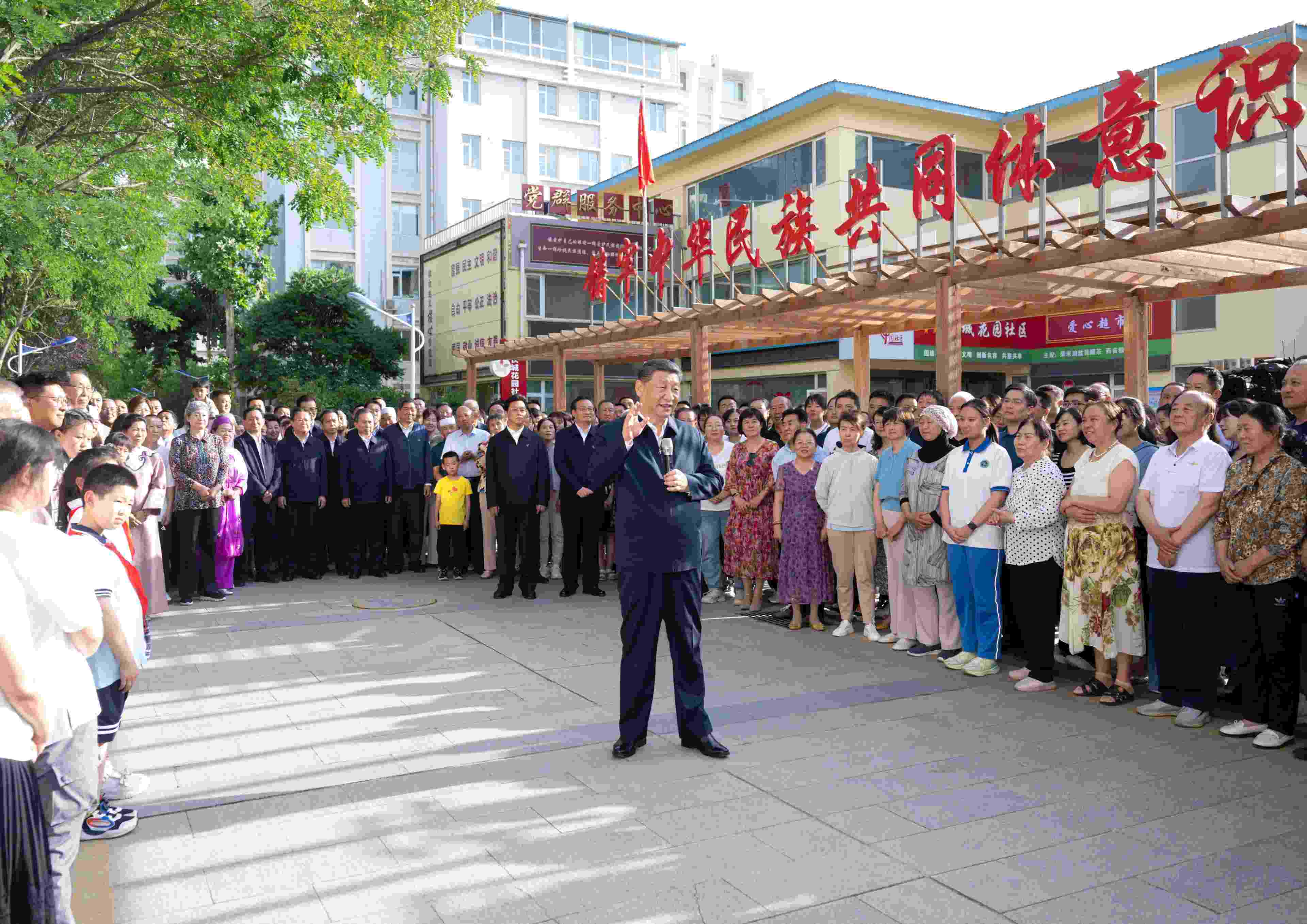 19日下午,習近平總書記來到寧夏銀川市金鳳區(qū)長城花園社區(qū)考察??吹竭@個多民族聚居的社區(qū)其樂融融,各族群眾和睦相處、生活幸福,習近平十分高興。他說,民族團結(jié)非常重要,我們五十六個民族要像石榴籽一樣緊緊抱在一起。五十六個民族凝聚在一起就是中華民族共同體,中華民族是一個大家庭。我們共同奮斗,一起推進中國式現(xiàn)代化,實現(xiàn)中華民族偉大復興?。ǘ派袧桑?/p>