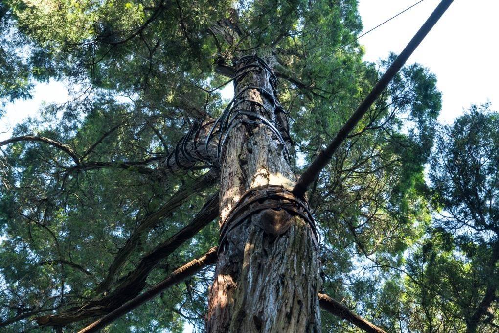 2024年8月12日在劍閣縣翠云廊拍攝的古樹“馬甲”,在樹干中部安裝碳纖維加固“馬甲”,與周邊樹木通過硬支護進行彈性連接,可以有效保障樹體安全穩(wěn)固。新華社記者 唐文豪 攝