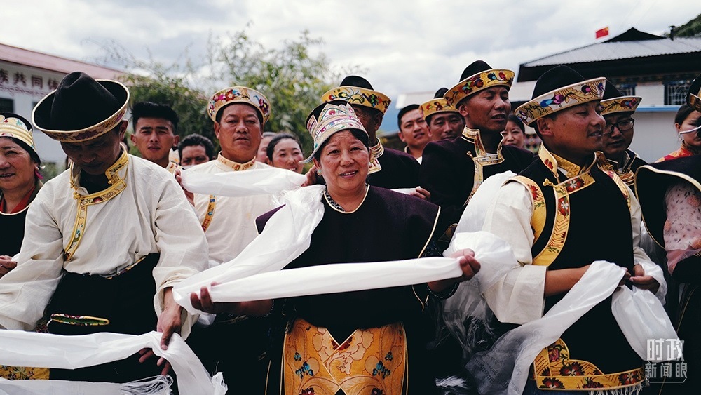 △2021年7月,習(xí)近平總書記來到西藏林芝市嘎拉村考察。村民們手捧哈達(dá),熱情迎接。(總臺央視記者彭漢明拍攝)