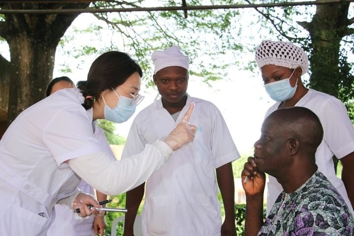 2024年6月6日,在貝寧阿波美中心醫(yī)院,中國第27批援貝寧醫(yī)療隊(duì)醫(yī)生為當(dāng)?shù)鼐用窈Y查眼科疾病。新華社發(fā)(塞拉芬攝)