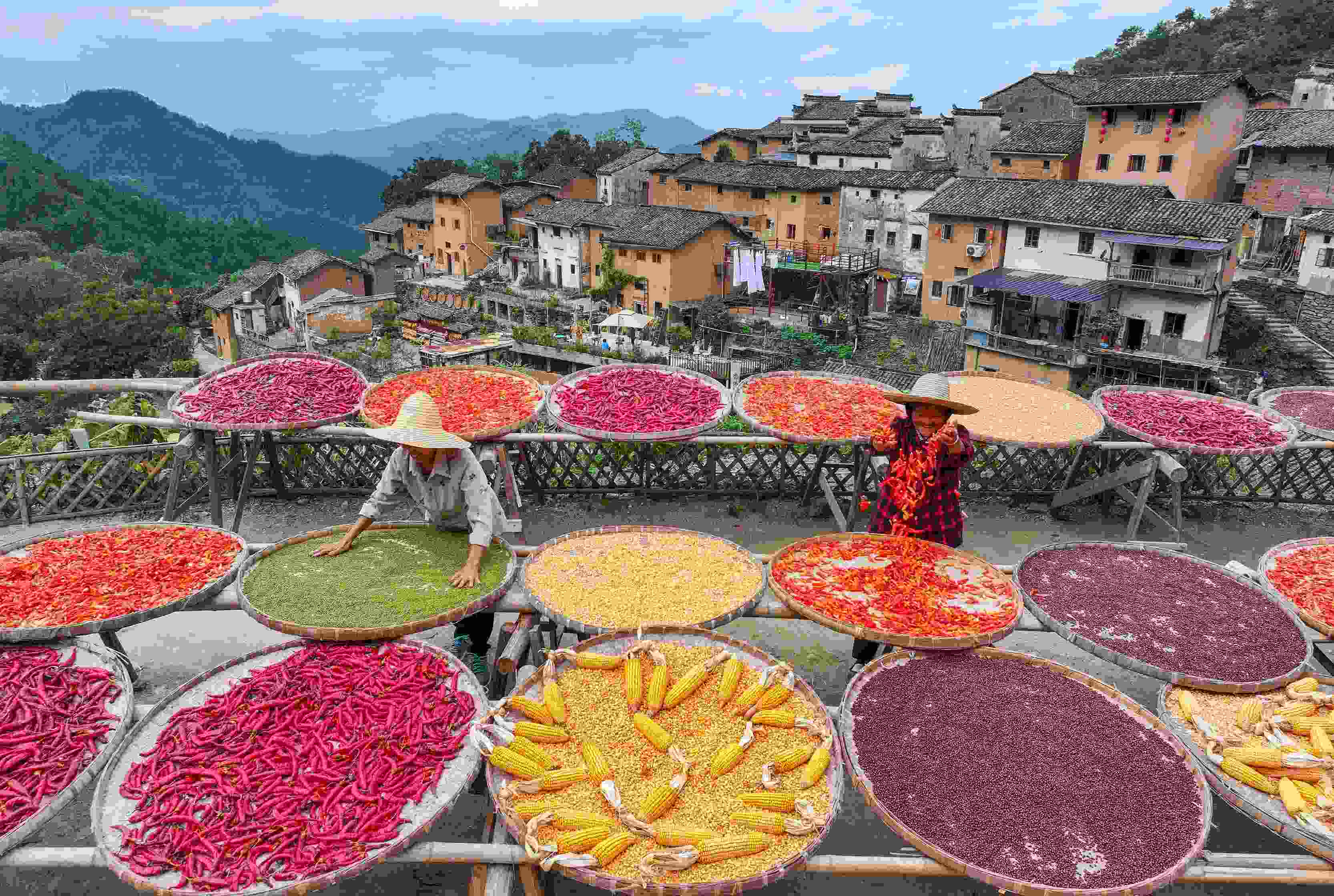 △2024年9月22日,安徽省黃山市歙縣陽產村,村民正在土樓前晾曬農作物。