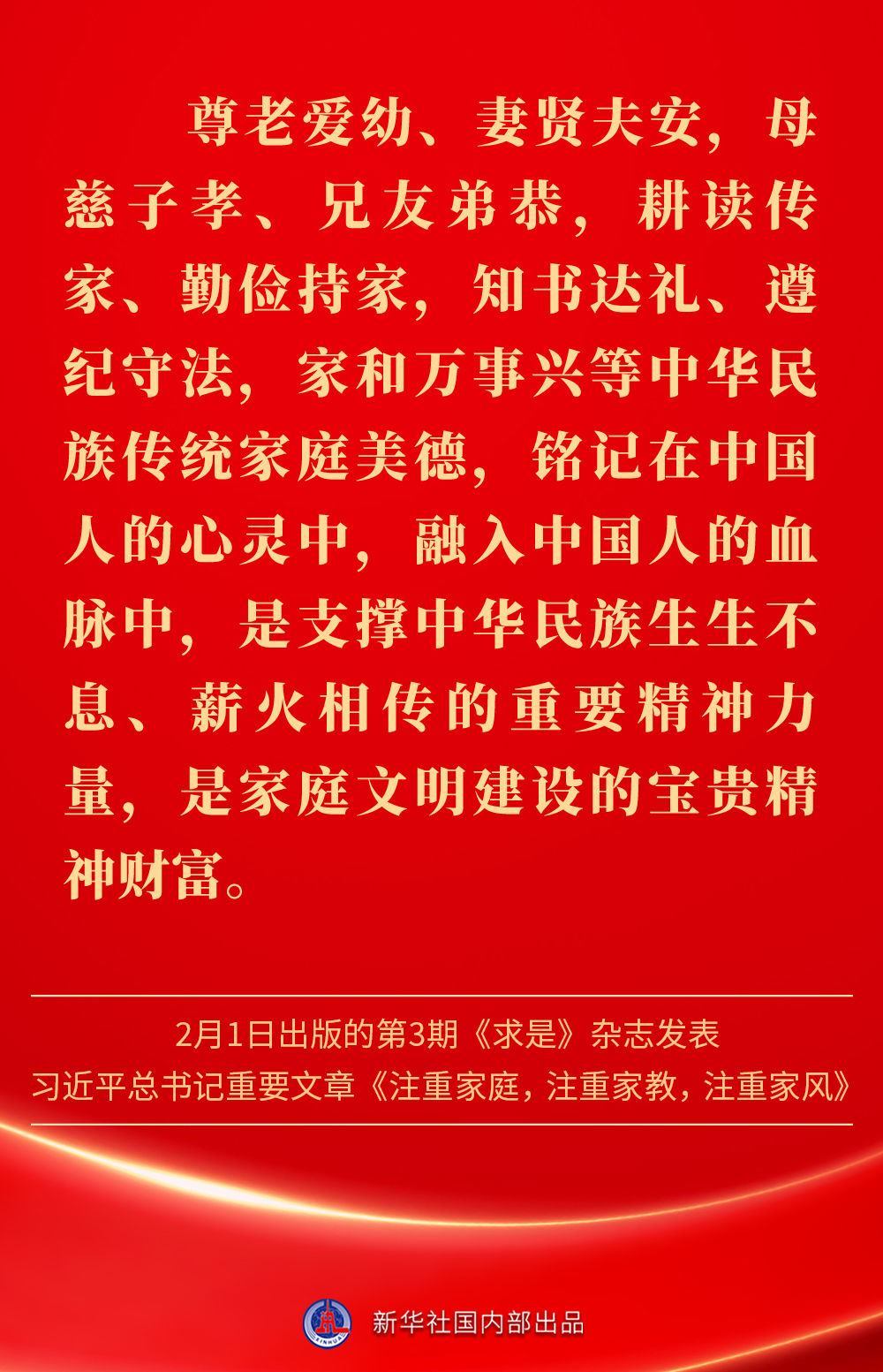 萬家團(tuán)圓共慶新春佳節(jié)之際,2月1日出版的第3期《求是》雜志發(fā)表習(xí)近平總書記重要文章《注重家庭,注重家教,注重家風(fēng)》。為什么要注重家庭、家教、家風(fēng)?如何做好家庭文明建設(shè)?習(xí)近平總書記這樣闡述——