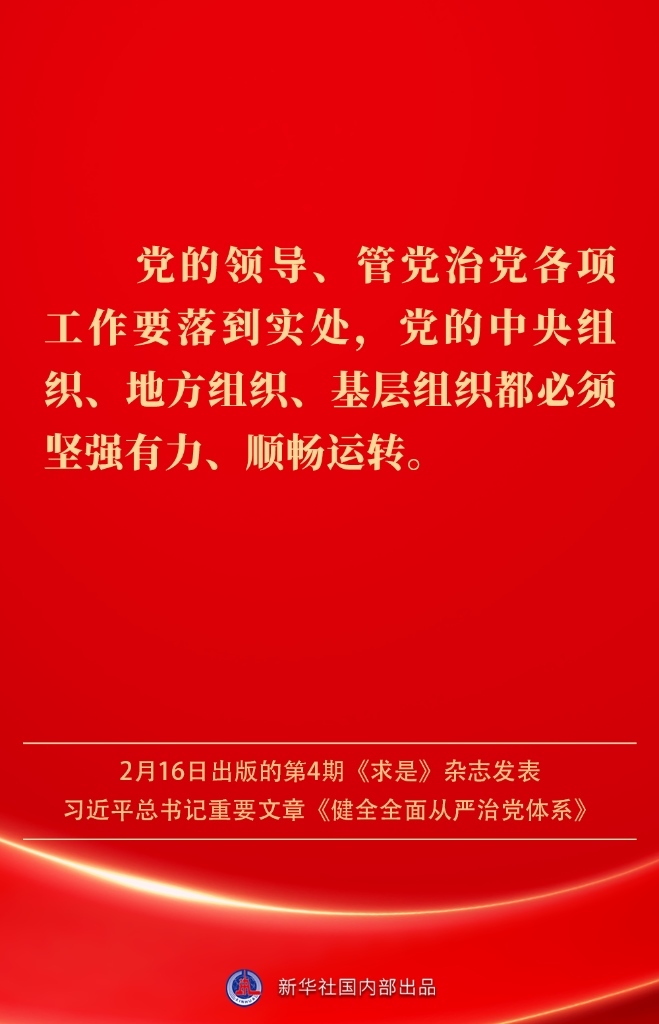2月16日出版的第4期《求是》雜志發(fā)表習(xí)近平總書記重要文章《健全全面從嚴(yán)治黨體系》。如何進(jìn)一步健全要素齊全、功能完備、科學(xué)規(guī)范、運(yùn)行高效的全面從嚴(yán)治黨體系?習(xí)近平總書記闡明要旨——