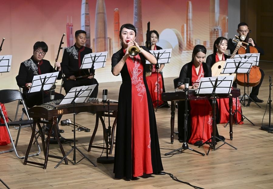 2023年11月24日,在馬來西亞雪蘭莪州的廈門大學(xué)馬來西亞分校,藝術(shù)家在音樂會上演奏?!敖z路粵韻——廣東民族音樂會”當(dāng)晚在廈門大學(xué)馬來西亞分校舉辦。新華社記者程一恒攝