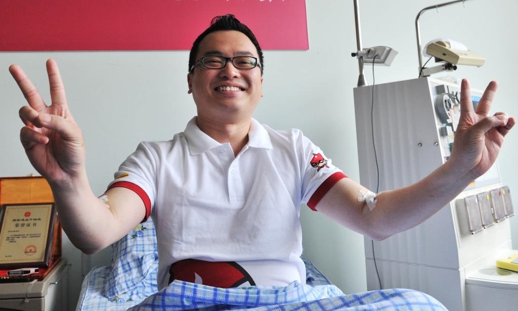 2012年4月17日,馬來西亞青年楊永康在造血干細胞采集結(jié)束后打出勝利的手勢。新華社記者岳月偉攝