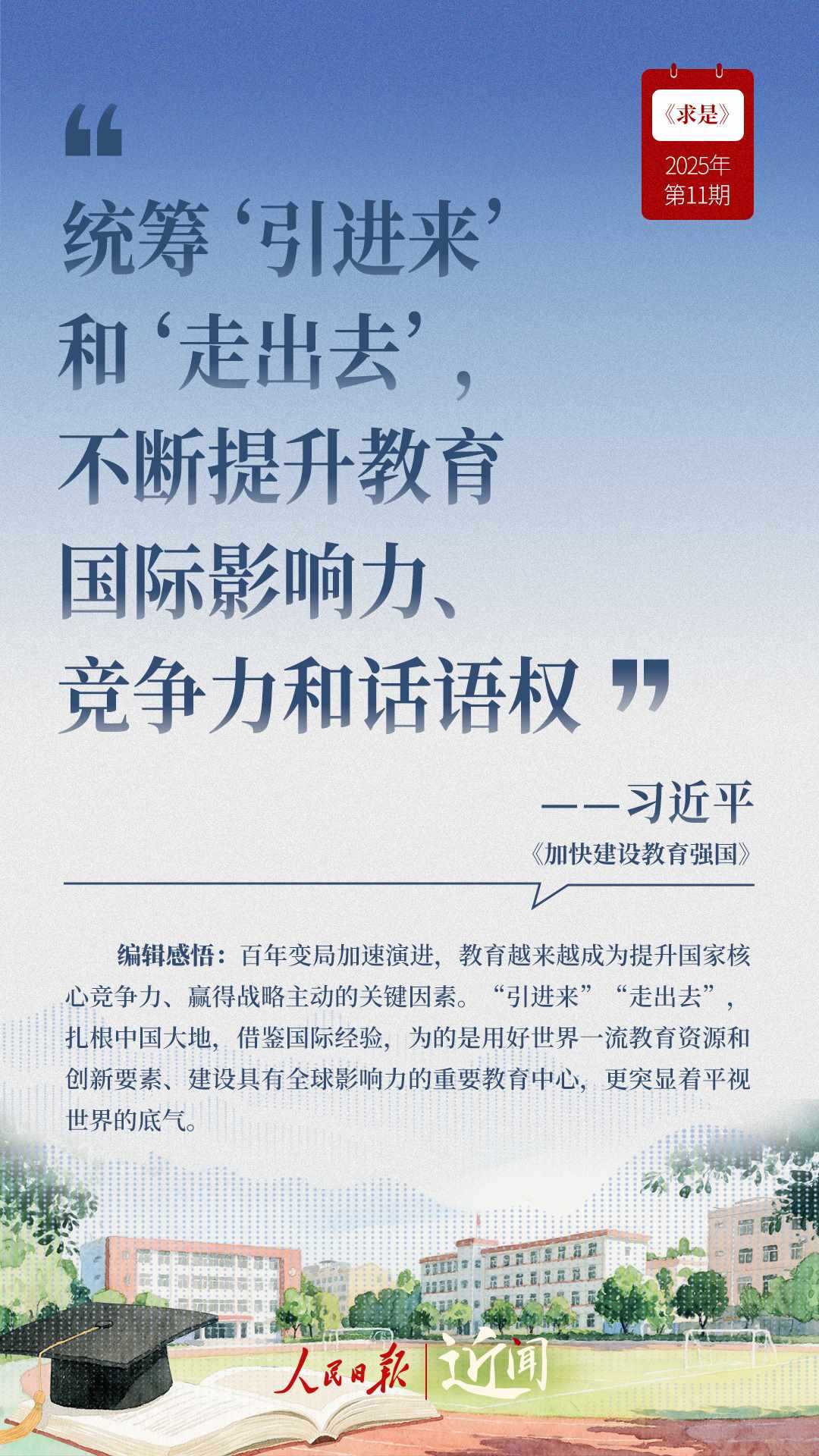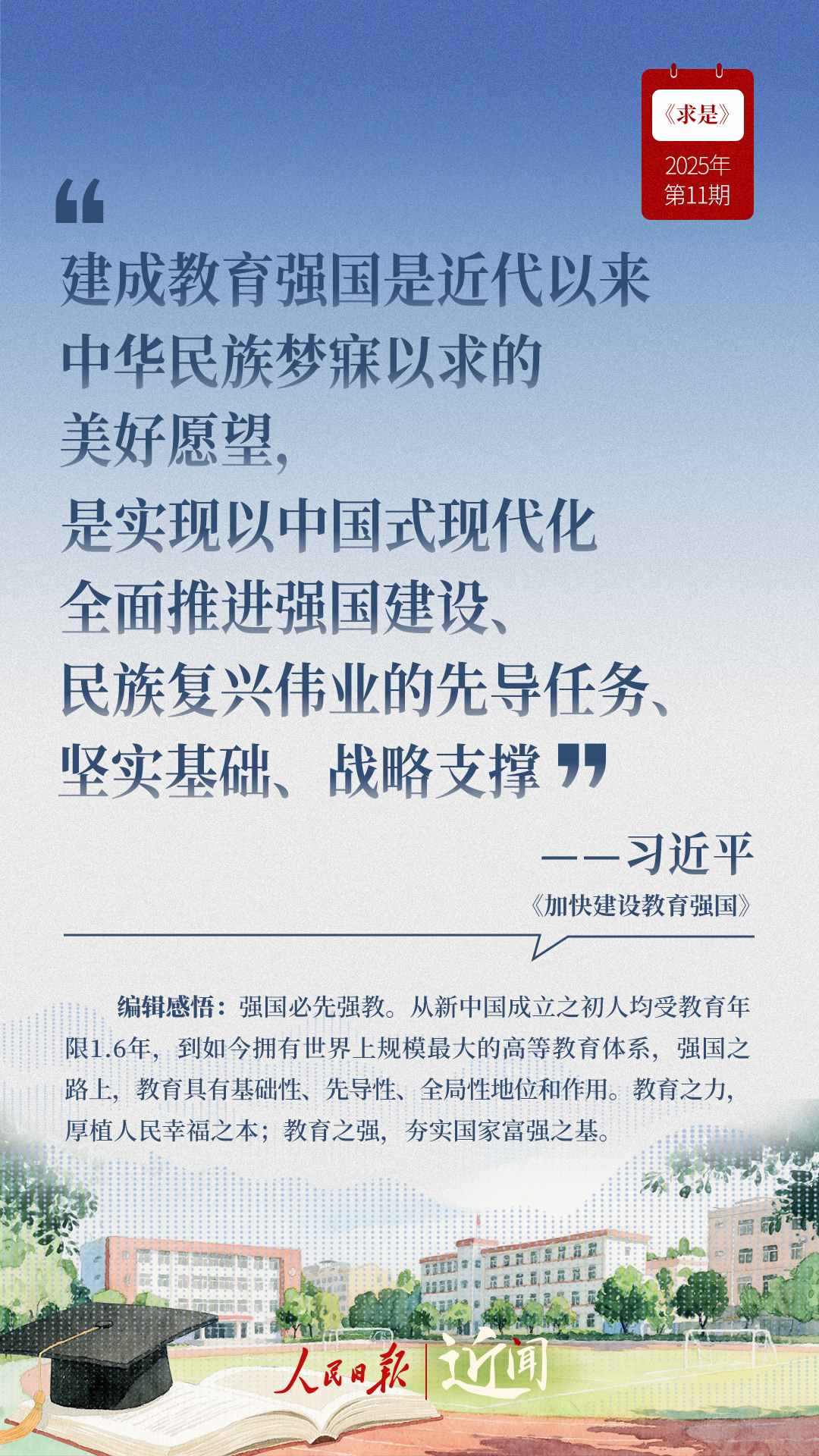 教育是國之大計、黨之大計。日前,《求是》雜志發(fā)表習近平總書記重要文章《加快建設教育強國》?!叭姘盐战逃恼螌傩?、人民屬性、戰(zhàn)略屬性”“讓教育改革發(fā)展成果更多更公平惠及全體人民”“讓教師享有崇高社會聲望、成為最受社會尊重的職業(yè)之一”……通過這些話,一起感悟習近平總書記對教育強國建設的謀劃與部署。