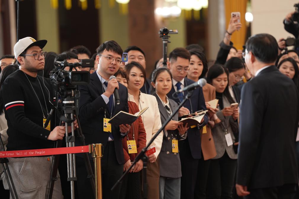 3月5日,第十四屆全國人民代表大會第四次會議首場“部長通道”集中采訪活動在北京人民大會堂舉行。這是記者在現(xiàn)場提問。