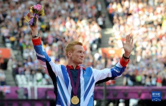 2012年8月5日,英國選手盧瑟福德在2012年倫敦奧運(yùn)會(huì)田徑男子跳遠(yuǎn)決賽頒獎(jiǎng)儀式上。新華社記者 楊磊 攝
