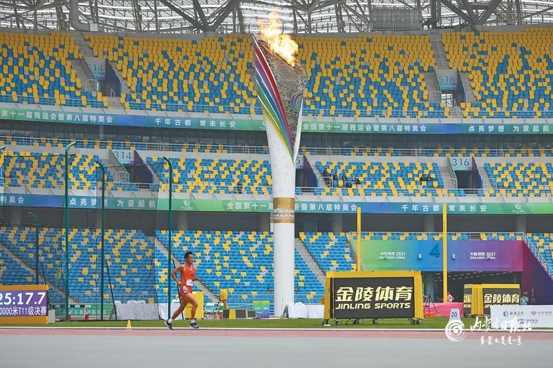 10 月23 日,男子t11 級(jí)10000米的賽場(chǎng)上,內(nèi)蒙古運(yùn)動(dòng)員孟可在沒(méi)有領(lǐng)跑員的不利條件下,依然堅(jiān)持跑完了全程。