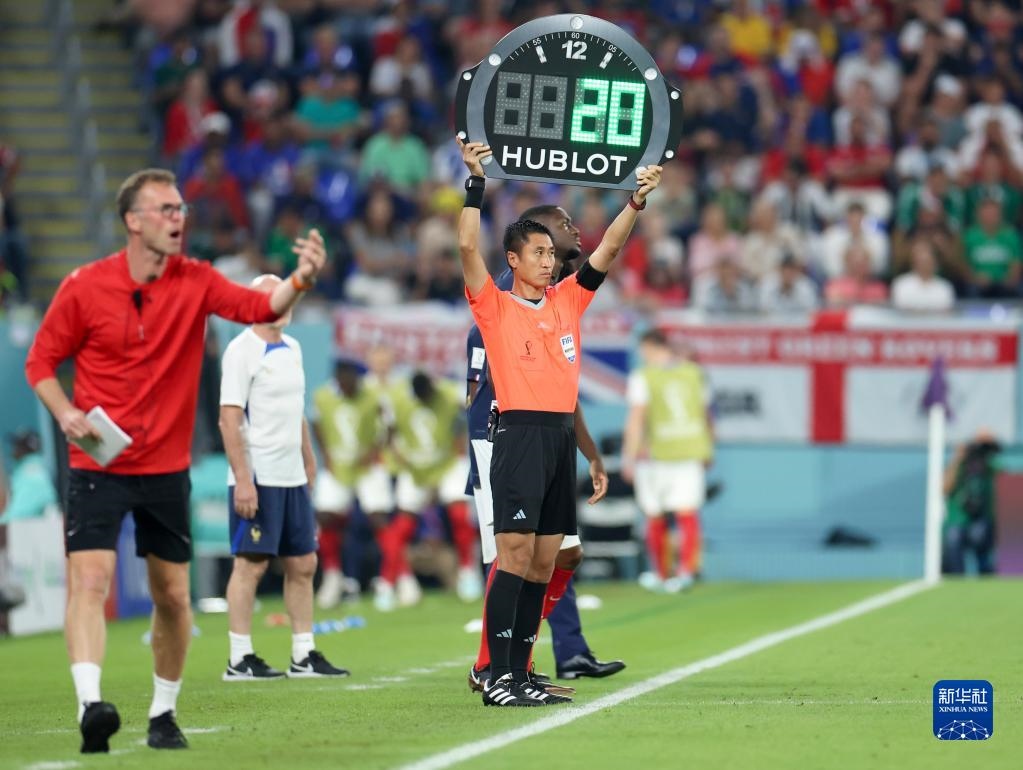 2022年11月26日,第四官員馬寧(右)在卡塔爾世界杯法國隊對丹麥隊的比賽中舉起換人牌。新華社記者 李明 攝