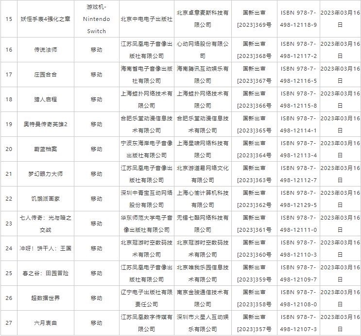 人民網(wǎng)北京3月21日電 (記者楊虞波羅)據(jù)國(guó)家新聞出版署官網(wǎng)消息,3月20日,2023年進(jìn)口網(wǎng)絡(luò)游戲?qū)徟畔⒄桨l(fā)布,共27款游戲獲得游戲版號(hào),其中包含22款移動(dòng)游戲、3款PC游戲、1款雙端游戲、1款NS游戲機(jī)游戲。