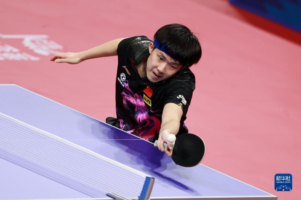 2022年10月9日,中國隊選手王楚欽在比賽中回球,他以3:0戰(zhàn)勝德國隊選手凱·斯達姆珀。當日,在成都世乒賽男團決賽中,中國乒乓球男隊3:0戰(zhàn)勝德國隊。 新華社記者胥冰潔攝