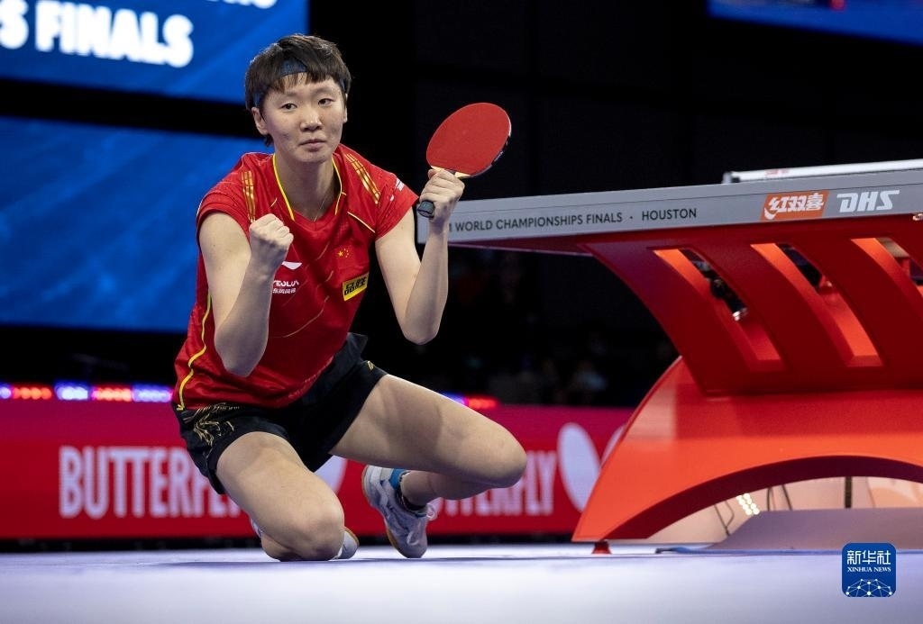 2021年11月29日,王曼昱慶祝奪冠。當日,在美國休斯敦進行的2021世界乒乓球錦標賽女子單打決賽中,中國選手王曼昱以4:2戰(zhàn)勝隊友孫穎莎,奪得冠軍。 新華社瓦格納攝