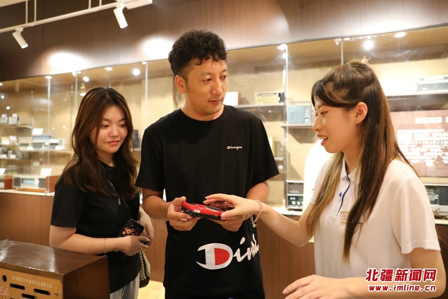 8月17日,游客在內蒙古包頭市固陽縣“固陽稒事”美食特產文創(chuàng)街的收音機收藏館參觀。