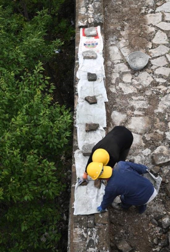 在箭扣長城122號敵臺東側(cè)墻體,工人給剛剛砌好的磚蓋上編織袋遮雨(7月2日攝)。新華社記者 陳鐘昊 攝