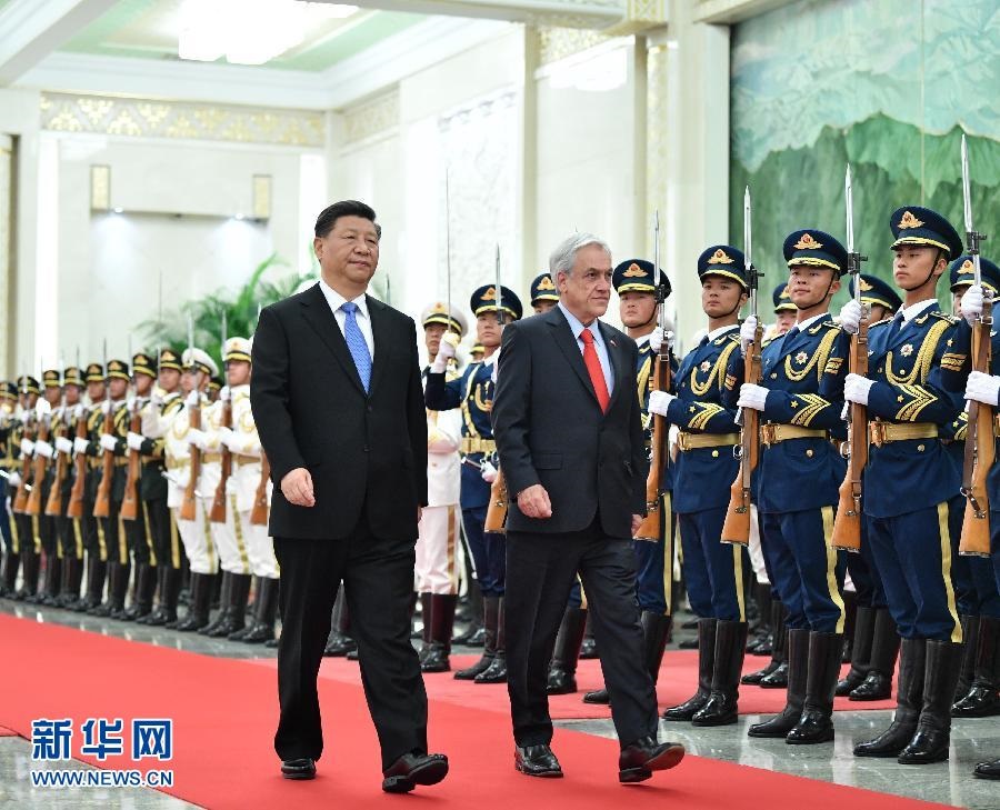 4月24日,國家主席習(xí)近平在北京人民大會(huì)堂同智利總統(tǒng)皮涅拉舉行會(huì)談。這是會(huì)談前,習(xí)近平在人民大會(huì)堂北大廳為皮涅拉舉行歡迎儀式。 新華社記者 饒愛民 攝