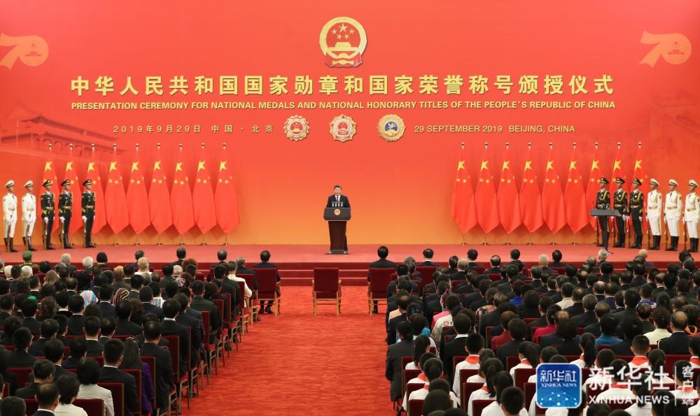 ↑9月29日,中華人民共和國國家勛章和國家榮譽稱號頒授儀式在北京人民大會堂金色大廳隆重舉行。中共中央總書記、國家主席、中央軍委主席習近平向國家勛章和國家榮譽稱號獲得者頒授勛章獎?wù)虏l(fā)表重要講話。新華社記者姚大偉攝