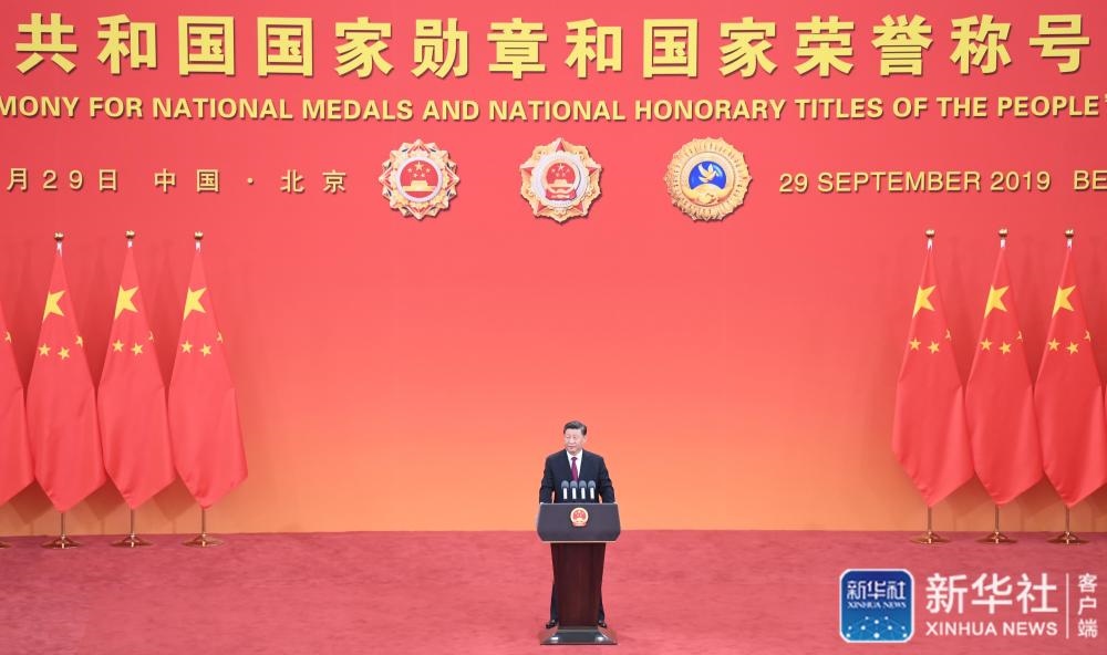 ↑9月29日,中華人民共和國國家勛章和國家榮譽稱號頒授儀式在北京人民大會堂金色大廳隆重舉行。中共中央總書記、國家主席、中央軍委主席習近平向國家勛章和國家榮譽稱號獲得者頒授勛章獎?wù)虏l(fā)表重要講話。新華社記者黃敬文攝