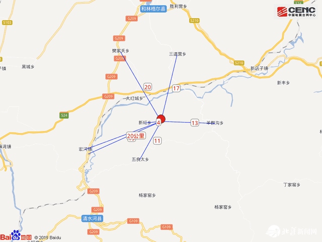震中距和林格爾縣27公里、距清水河縣29公里、距山西右玉縣55公里、距托克托縣58公里、距準(zhǔn)格爾旗60公里,距呼和浩特市76公里。